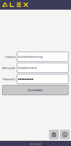 Im Feld "Kunde" muss beim App-Login der Domain-Name (alex.kunde.at) eingetragen werden.