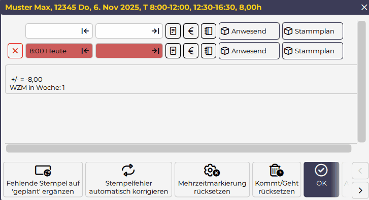 Die fehlerhaften Stempelungen werden direkt im Kommt-/Gehtfenster bearbeitet und mittels manueller Eingabe eingetragen.