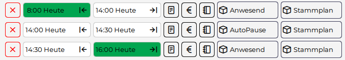 Anmerkung zu den folgenden Beispielen: die AutoPause entsteht nicht durch die automatische Korrektur der Zeitstempel, sondern weil in diesem System eine automatische Ruhepause hinterlegt ist.