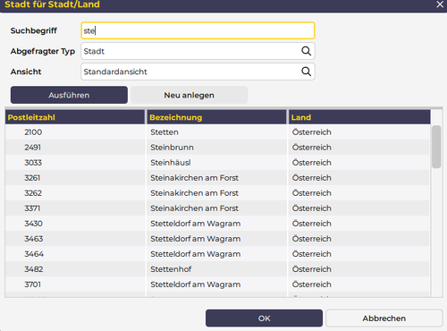 Bei den eingespielten Postleitzahlen handelt es sich um eine im System fix definierte Liste von Orten in Österreich. Außerdem werden Österreich und alle Nachbarländer als Land angelegt.