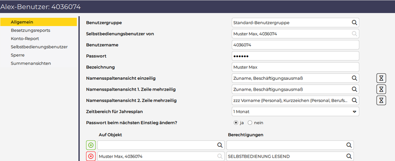 Wird die definierte Berechtigung am System geändert, so hat dies keine Auswirkung auf bestehende Selbstbedienungsbenutzer. Nur bei neuem Personal wird dann je nach gewählter Berechtigung ein Selbstbedienungsbenutzer mit der entsprechenden Rolle angelegt.