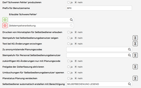 • D.h., dass z.B. Eingaben, welche einen AZG-Fehler oder Tages-/Wochenüberstunden auslösen würden, durch den SB-Benutzer nicht getätigt werden können, solang hier auf NEIN gestellt ist.